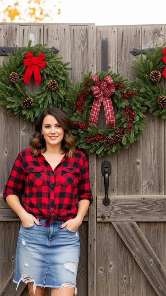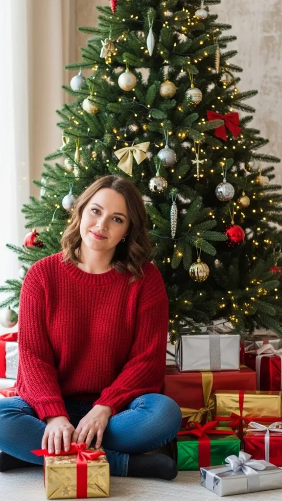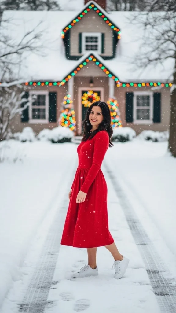 A red sweater and jeans combo is the easiest win for Christmas Day. It’s laid-back but still festive enough for family photos. Pair a chunky red knit with straight-leg blue jeans and white sneakers. Add small details like gold hoop earrings or a plaid scarf for that extra holiday touch.