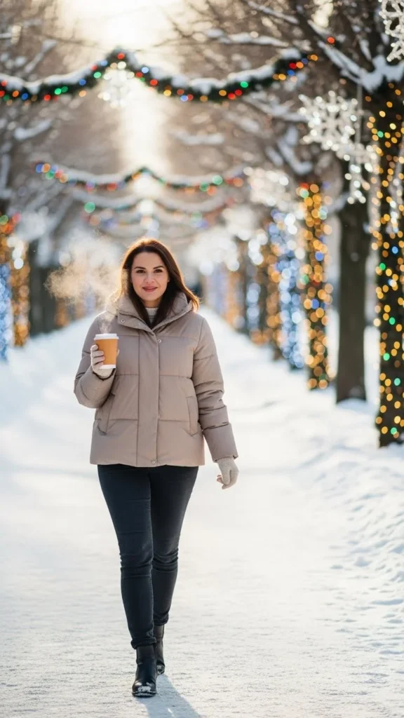 Pair it with skinny jeans and boots. Add a beanie or earmuffs for charm. Look chic and stay cozy for outdoor Christmas markets or walks.