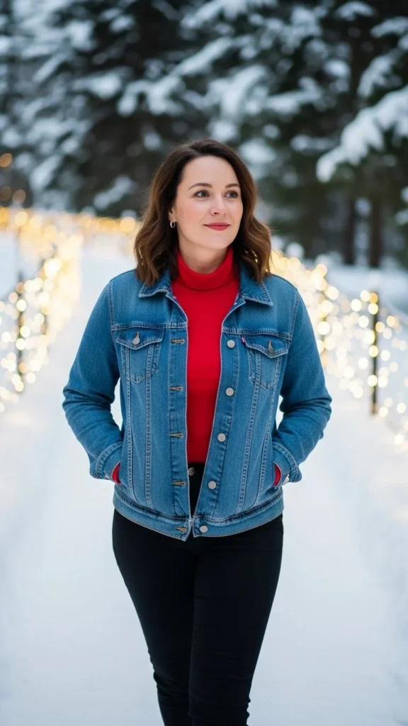 Add a Santa hat or scarf for fun. Denim jackets are year-round pieces, so this one outfit can easily reappear all winter.
