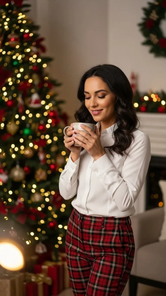 If you’re feeling playful, add red lipstick or small gold hoops. You can DIY plaid pants from fabric remnants or find them at thrift stores for cheap.