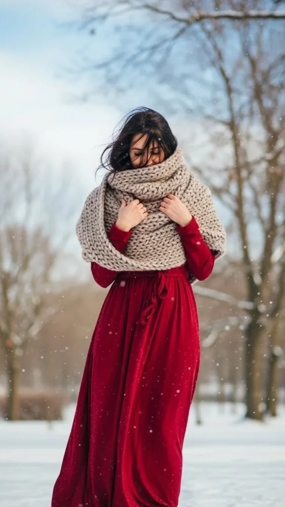 A chunky scarf can change any outfit’s vibe. Layer it over a red or green dress for warmth and charm.