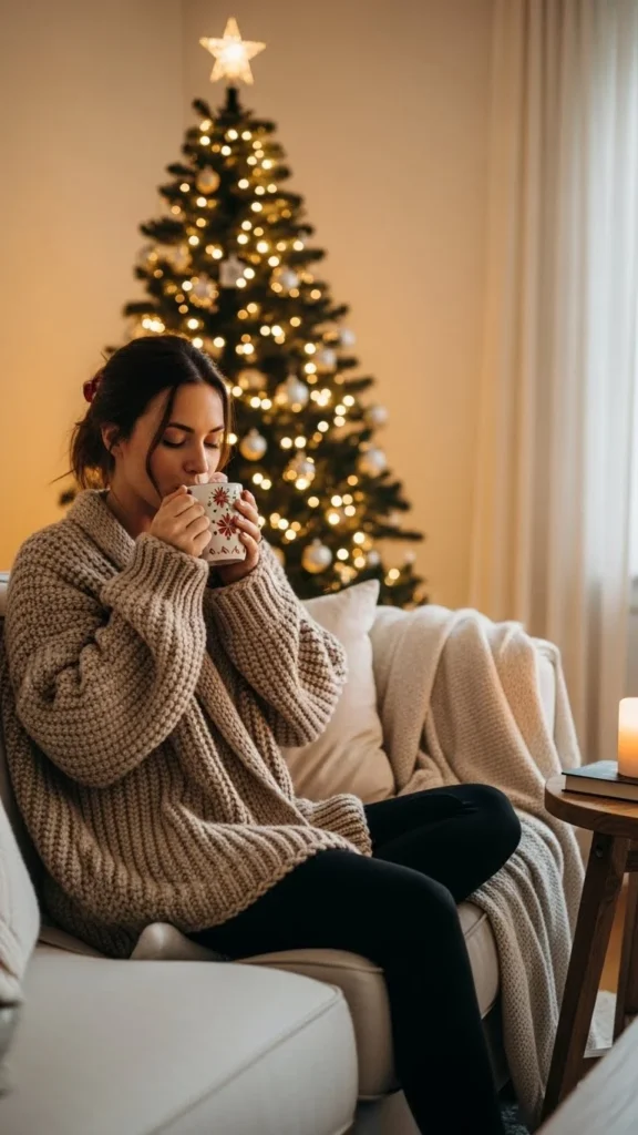 If you don’t own a sweater dress, repurpose an oversized sweater with thick tights underneath. It creates the same vibe without spending extra. Add minimal jewelry and soft curls to finish your Christmas-ready look.